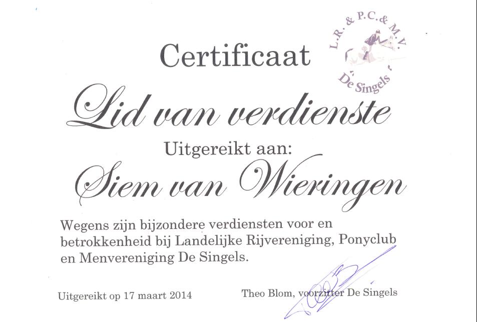 Tijdens de algemene ledenvergadering van De Singels op 17 maart 2014 werd Siem van Wieringen voor zowel zijn betrokkenheid als alle werkzaamheden voor De Singels gehuldigd als Lid van Verdienste.