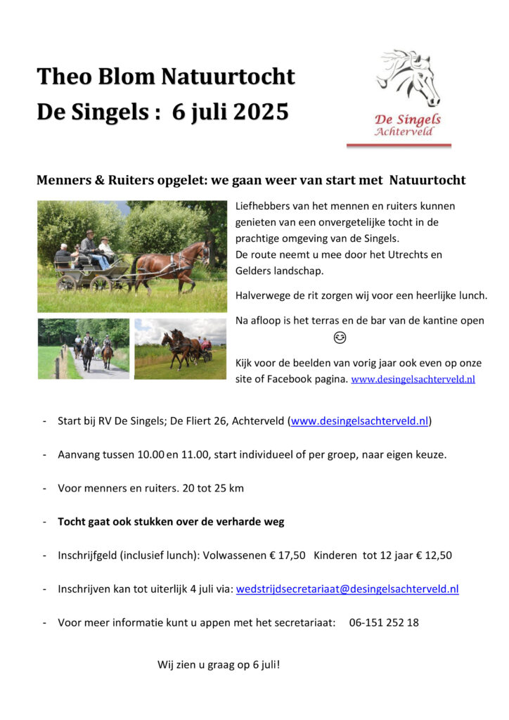 Het weer de tijd van het jaar en de route voor de natuurtocht ligt alweer klaar! Voor menners en ruiters. We gaan over paden waar je normaal niet zomaar overheen mag rijden. Schitterende natuur, lunch met koffie en thee. T